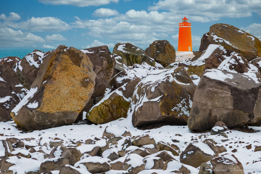 We checked out one more lighthouse near the Keflavik International Airport that was not marked in Google Maps or in any travel guide. It was located next to a quarry. It snowed during the night before we left Iceland & I went back before returning the rental car to shoot an image of the lighthouse surrounded by rocks with snow.