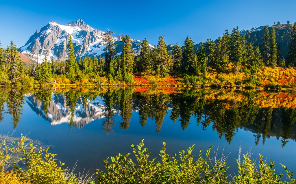 After hiking for about 2.5 hrs, we got back into Chris’s BMW convertible and went to Picture Lake/Highwood Lake next to the ski area. Both are perfect spots to photograph Mt. Shuksan reflections. In early October, the fall foliage around both lakes add a lot of color to the scenery. You will need patience for the water to be still to capture good reflections. I have seen photographers use polarizing filters to bring out the saturation of fall colors but I prefer a higher shutter speed to crisply capture the reflections. YMMV. Here are three images, first & second shot at Picture Lake and the third captured at Highwood Lake.