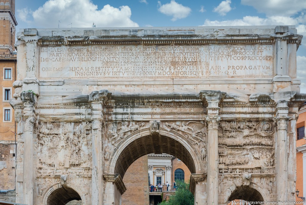 We concluded the Roman Forum walk at the The Arch of Septimius Severus (Italian: Arco di Settimio Severo) . It is a white marble triumphal arch dedicated in 203 to commemorate the Parthian victories of Emperor Septimius Severus and his two sons, Caracalla and Geta, in the two campaigns against the Parthians of 194/195 and 197–199.