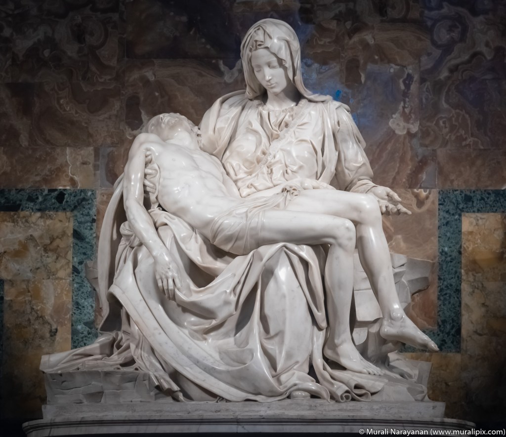 Subsequent to its carving the Pietà sustained much damage. Four fingers on Mary’s left hand, broken during a move, were restored in 1736 by Giuseppe Lirioni, and scholars are divided as to whether the restorer took liberties to make the gesture more “rhetorical.” The most substantial damage occurred on 21 May 1972, when a mentally disturbed geologist, the Hungarian-born Australian Laszlo Toth walked into the chapel and attacked the sculpture with a geologist’s hammer while shouting “I am Jesus Christ; I have risen from the dead!” With fifteen blows he removed Mary’s arm at the elbow, knocked off a chunk of her nose, and chipped one of her eyelids. Onlookers took many of the pieces of marble that flew off. Later, some pieces were returned, but many were not, including Mary’s nose, which had to be reconstructed from a block cut out of her back. After the attack, the work was painstakingly restored and and is now protected by a bulletproof acrylic glass panel. As the Pieta is behind the acrylic panel and the chapel is understandably not well illuminated, it is tough to photograph it. It is also quite crowded (but not as bad as the crowd at the Mona Lisa exhibit in the Louvre, Paris) and I had to patiently wait to move to a good spot to capture the image with minimum reflections.