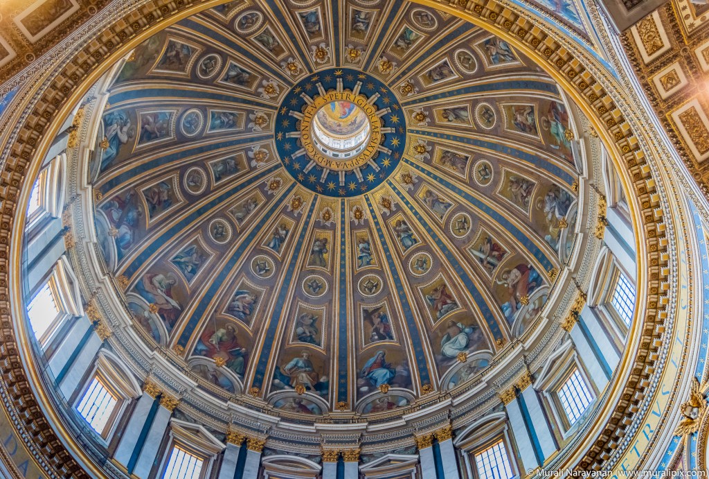 The dome of St. Peter’s rises to a total height of 136.57m (448.1 ft) from the floor of the basilica to the top of the external cross. It is the tallest dome in the world. Its internal diameter is 41.47m (136.1 ft), slightly smaller than two of the three other huge domes that preceded it, those of the Pantheon and the Duomo Of Florence. It has a greater diameter by approximately 9.1m than Constantinople’s Hagia Sophia church, completed in 537. It was to the domes of the Pantheon and Florence Duomo that the architects of St. Peter’s looked for solutions as to how to go about building what was conceived, from the outset, as the greatest dome of Christendom.