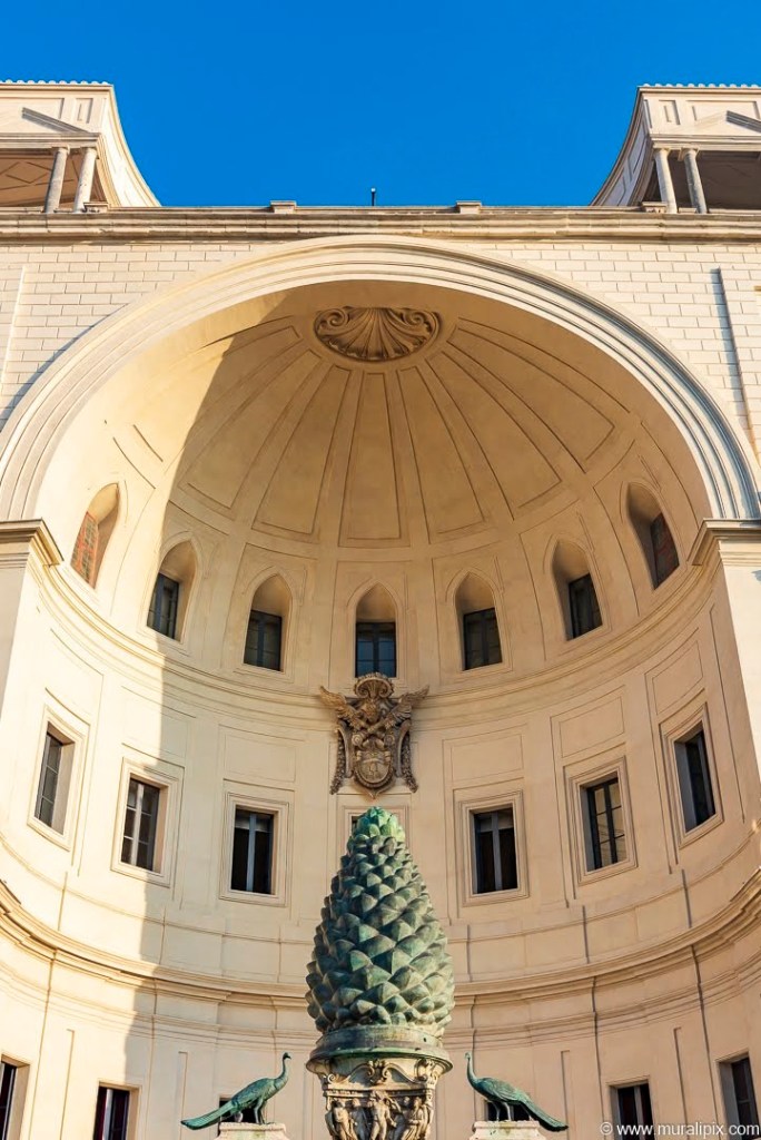 The Fontana della Pigna or simply Pigna (“The Pine cone”) is a former Roman fountain which now decorates a vast niche near the entrance to the Vatican Museums facing the Cortile della Pigna. Composed of a large bronze pine cone almost four meters high which once spouted water from the top, the Pigna originally stood near the Pantheon. It was moved to the courtyard of the Old St. Peter’s Basilica during the Middle Ages and then moved again, in 1608, to its present location. The courtyard where it stands was originally part of the Cortile del Belvedere, designed by Donato Bramante to connect the palace of Pope Innocent VIII with the Sistine Chapel. When Bramante died, architect Pirro Ligorio finished the project and added the wall and niche to close the courtyard. Construction of the Vatican Library divided the Cortile del Belvedere into two areas. The upper part of the courtyard, the Cortile della Pigna, takes its name from the fountain. The bronze peacocks on either side of the fountain are copies of those decorating the tomb of the Emperor Hadrian, now the Castel Sant’Angelo. The original peacocks are in the Braccio Nuovo Museum.