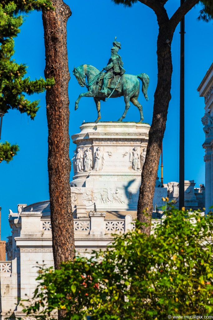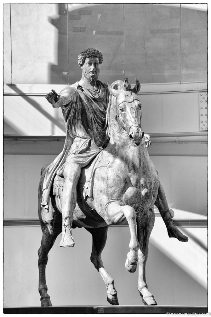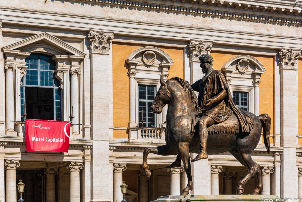 The statue of a mounted rider in the center of the piazza is of Emperor Marcus Aurelius. It is a copy, the original being housed on-site in the Capitoline museum.
