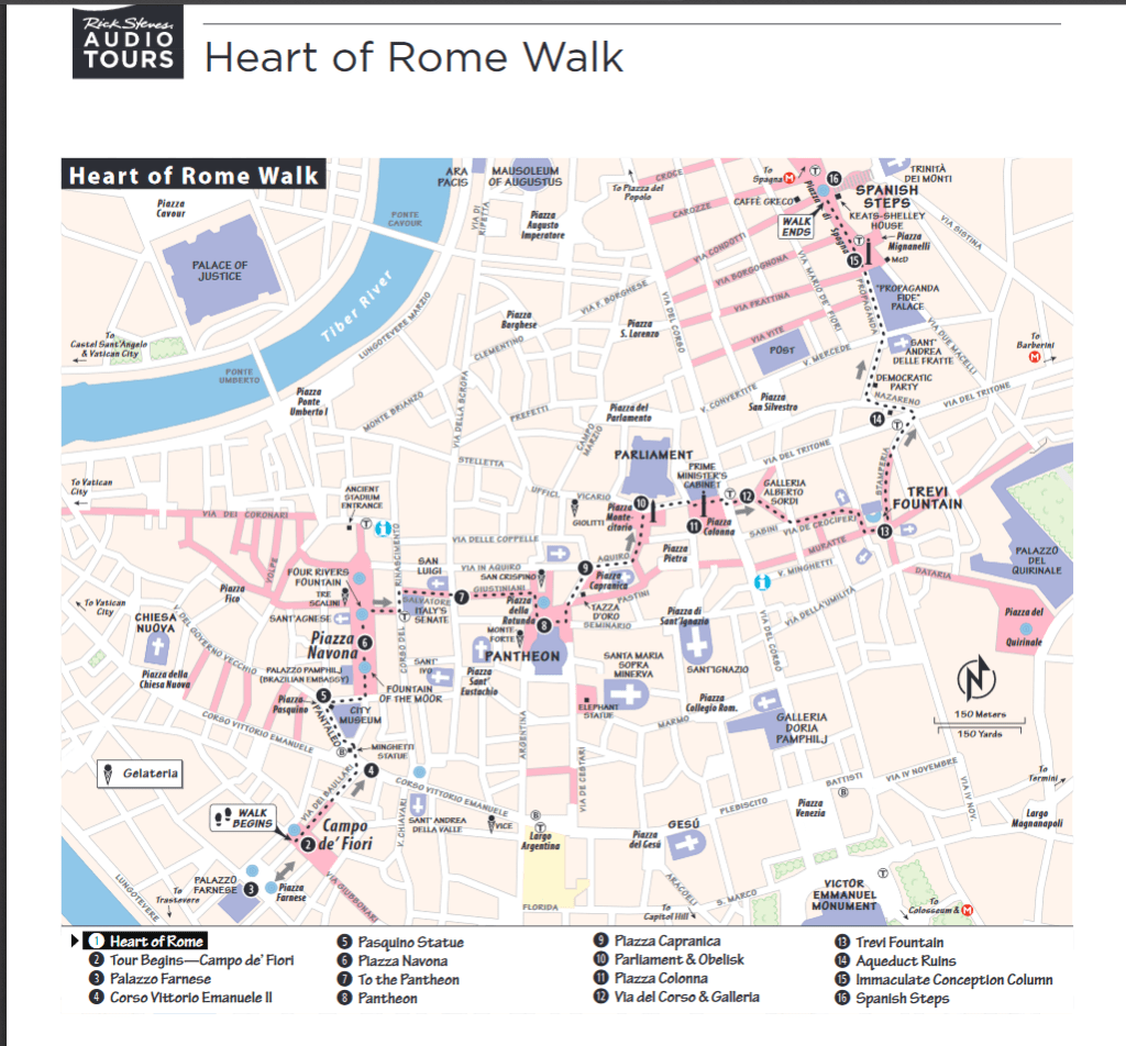 We used Rick Steves’s audio tour guide that we had downloaded into our phones to do the tour in the morning of Day 4. We started the tour at Campo de Fiori and ended it at the Galleria Alberto Sordi. The map below shows the tour.