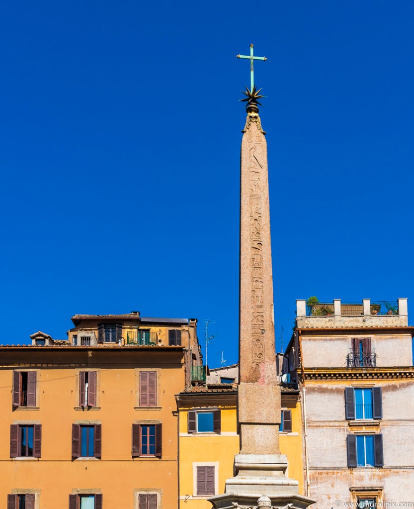 Piazza della Rotonda is roughly rectangular, approximately 60 meters north to south and 40 meters east to west, with a fountain and obelisk in the center and the Pantheon on the south side. In the center of the piazza is a fountain, the Fontana del Pantheon, surmounted by an Egyptian obelisk. The fountain was constructed by Giacomo Della Porta under Pope Gregory XIII in 1575, and the obelisk was added to it in 1711 under Pope Clement XI. The obelisk, originally constructed by Pharaoh Ramses II for the Temple of Ra in Heliopolis, had been brought to Rome in ancient times where it was reused as a shrine to the Egyptian god Isis that stood to the southeast of the Pantheon. It was rediscovered in 1374 underneath the apse of the nearby Basilica of Santa Maria sopra Minerva. In the mid-15th century, the obelisk had been erected in the small Piazza di San Macuto some 200 meters east of the Pantheon, where it remained until its 1711 move to the Piazza della Rotonda. It is still called the Obelisco Macutèo after its previous location.