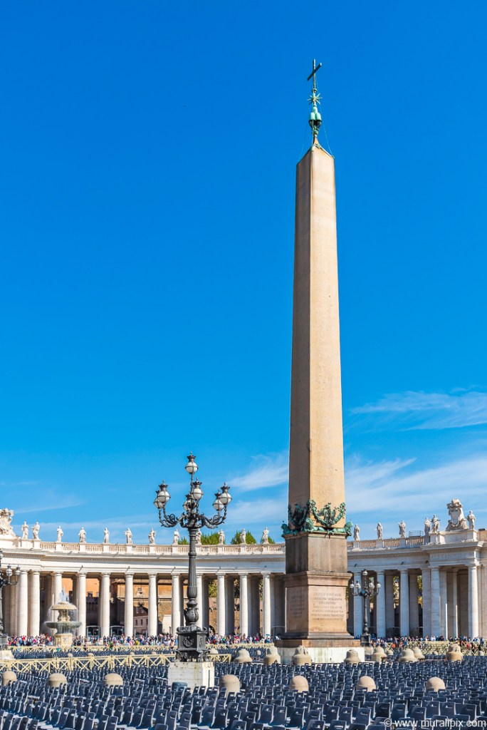 The Egyptian obelisk at the center of the square was brought to Rome by Emperor Caligula in 37 AD. It originally stood in his circus on a spot to the south of the basilica, close to the present Sacristy. Pope Sixtus V moved it in 1586 to the current spot. It is also a sun dial, its shadows mark noon over the signs of the zodiac in the white marble disks in the paving of the square. While we were there, preparations were going on for the canonization of St. Paul VI and others and you can see the chairs nicely laid out throughout the square.