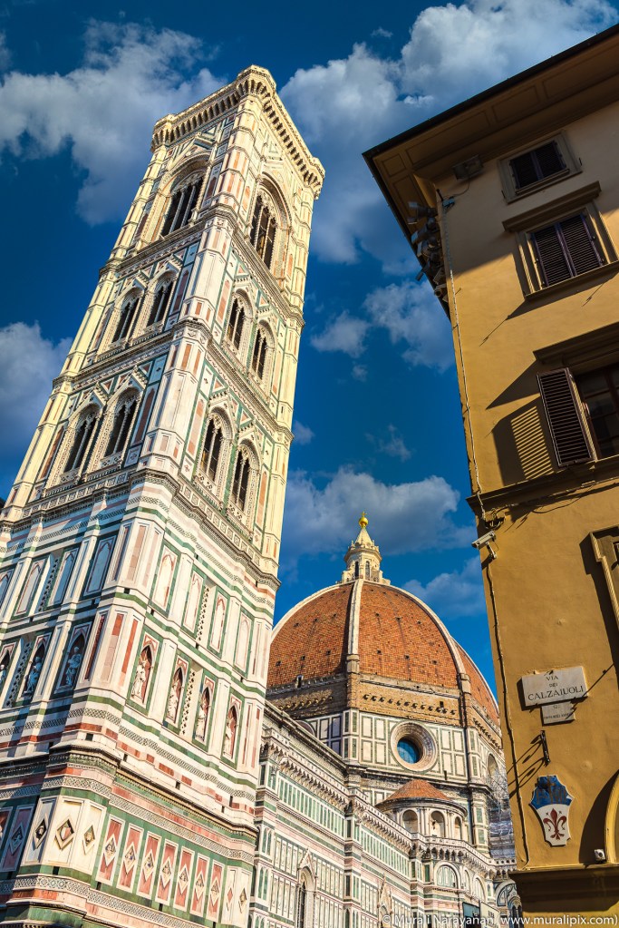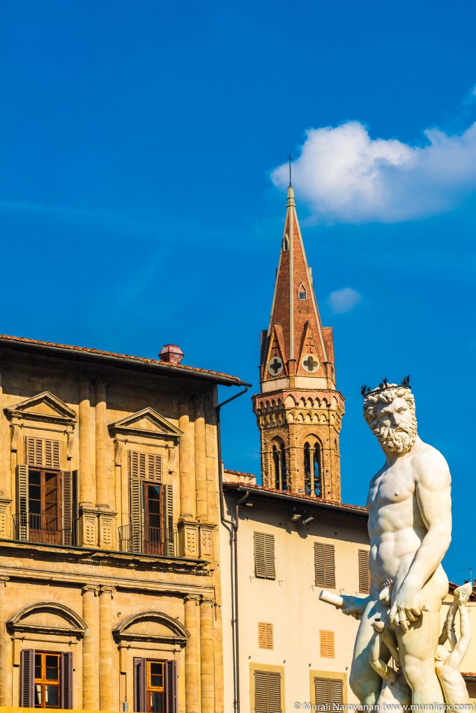 It turned out to be a challenge to get to a restroom around Piazza della Signoria. I walked into a few hotels and restaurants with no success. Finally found the Hotel Bernini Palace where the Concierge allowed me to use their restaurant. When I was walking out, I found a beautiful view of the Campanile Della Basilica Di Santa Croce. The image I captured from the lobby of the hotel below.