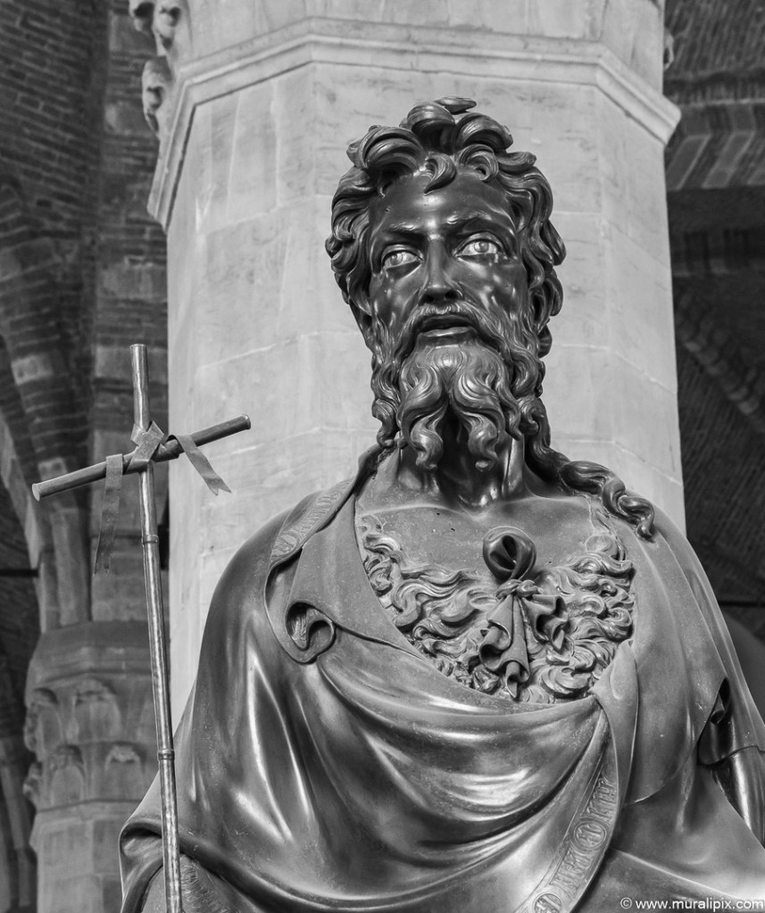 The church was originally built as a grain market in 1337. Between 1380 and 1404, it was converted into a church used as the chapel for Florence’s powerful craft and trade guilds. On the ground floor of the square building are the 13th-century arches that originally formed the loggia of the grain market. The second floor was devoted to offices, while the third housed one of the city’s municipal grain storehouses, maintained to withstand famine or siege. Late in the 14th century, the guilds were charged by the city to commission statues of their patron saints to embellish the facades of the church. The sculptures seen today are copies, the originals having been moved to museum, currently occupying the third floor. The artists who created these statues were the founders of the Italian Renaissance such as Lorenzo Ghiberti (famous for creating the bronze doors of the Florence Baptistery), Donatello (creator of numerous status in Florence), Filippo Brunelleschi (who designed and built the dome of the Duomo), and others. Note that these artists were at their peak about 60 years before Michelangelo was born. Below are the significant statues we saw.