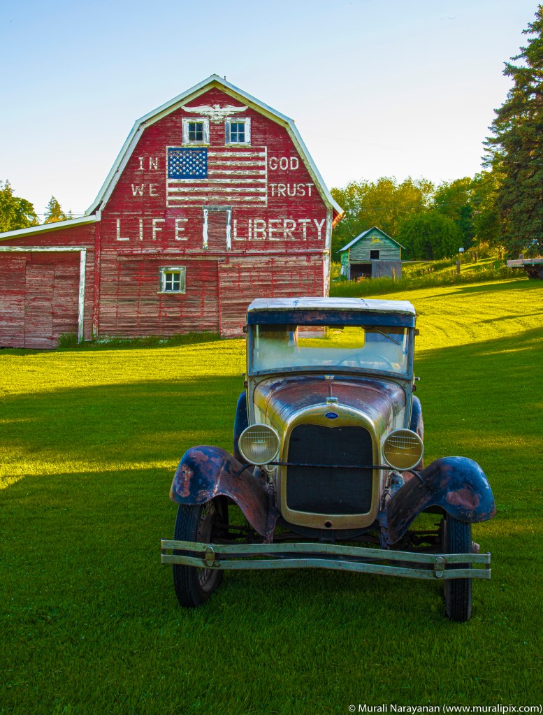 In the small town of Latah on the northeast of the Palouse is a beautiful barn with the words “In God We Trust Life Liberty” and an American flag painted on it. When we were two weeks ago (June 2020), there were three antique automobiles parked in front. We were there in the morning. As there are other structures as well as a fence around it, you have limited options to photograph. Here are 2 images I captured.