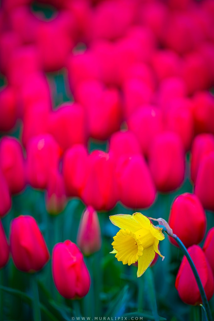While walking around the field, I noticed a lonely daffodil among a large group of pink tulips. The contrast was worthy of a shot.