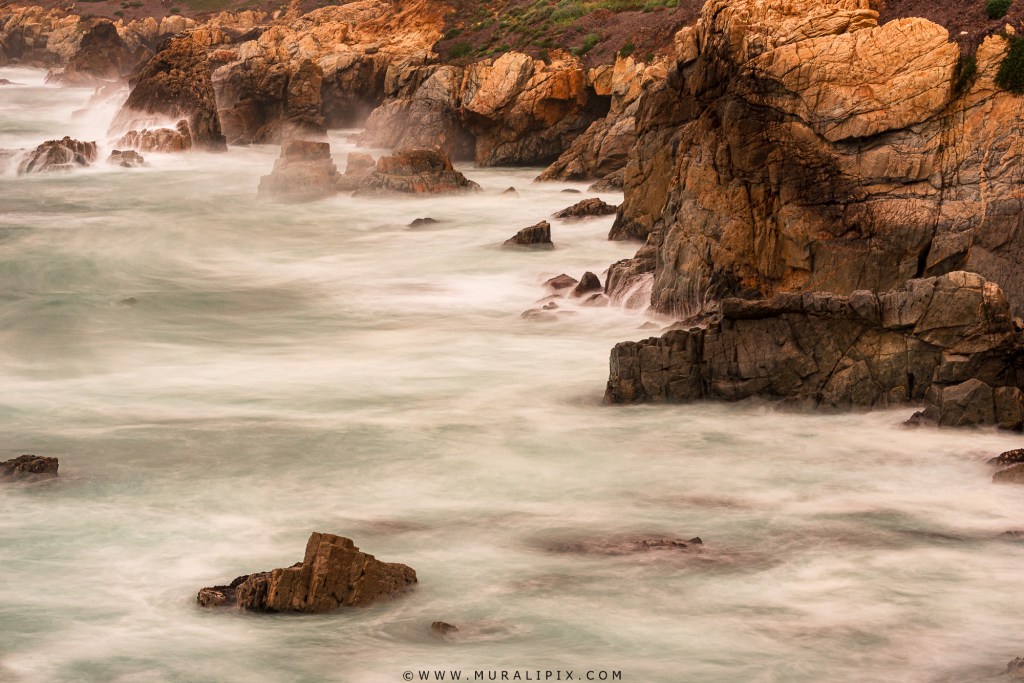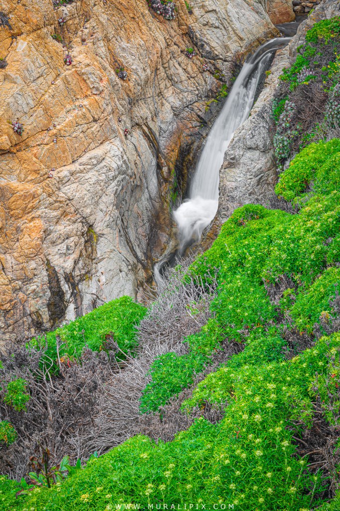 After an early dinner at another Brewery restaurant, we drove south to Garrapata State Park for sunset. We parked the car at the Soberanes Canyon Trailhead and hiked the Soberanes Point trail towards Painters Point. Painters Point offers breathtaking coastal views that attract artists and photographers alike. The rugged cliffs, crashing waves, and vibrant wildflowers create a picturesque scene that’s perfect for capturing the beauty of the Pacific coastline. Although we didn’t experience any colors at sunset, I ended up photographing the waves crashing on to the cliffs and a small waterfall along the Soberanes Creek.