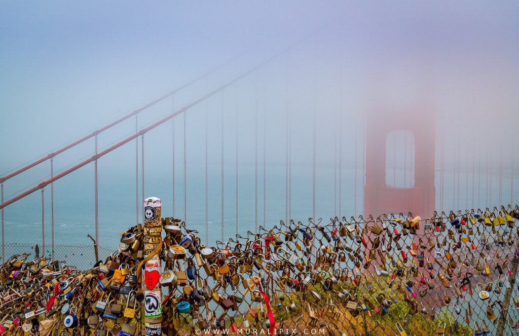 We left my friend’s home in Menlo Park at 430am and drove straight to Battery Spencer in Sausalito. It was chilly and super windy. We did the short hike from the parking lot to the edge of the battery. The Golden Gate bridge was barely visible due to the usual fog. A few minutes later, visibility improved a bit, and we could see the nearest span of the awesome bridge. We noticed the “love locks” along the fence of Battery Spencer. I captured an image.