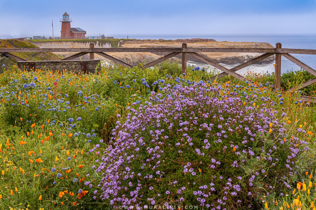 We left the hotel about 30 minutes after check-in and drove directly to the West Cliff Dog Park near the Surfing Museum. The Museum, located in the Mark Abbott Memorial Lighthouse, offers a fascinating glimpse into the rich history of surfing in Santa Cruz. The park next to the Museum is ideal to photograph sunrise and sunset. The park was brimming with wildflowers such as Ice Plants, Poppies, and Purpletop Vervain.